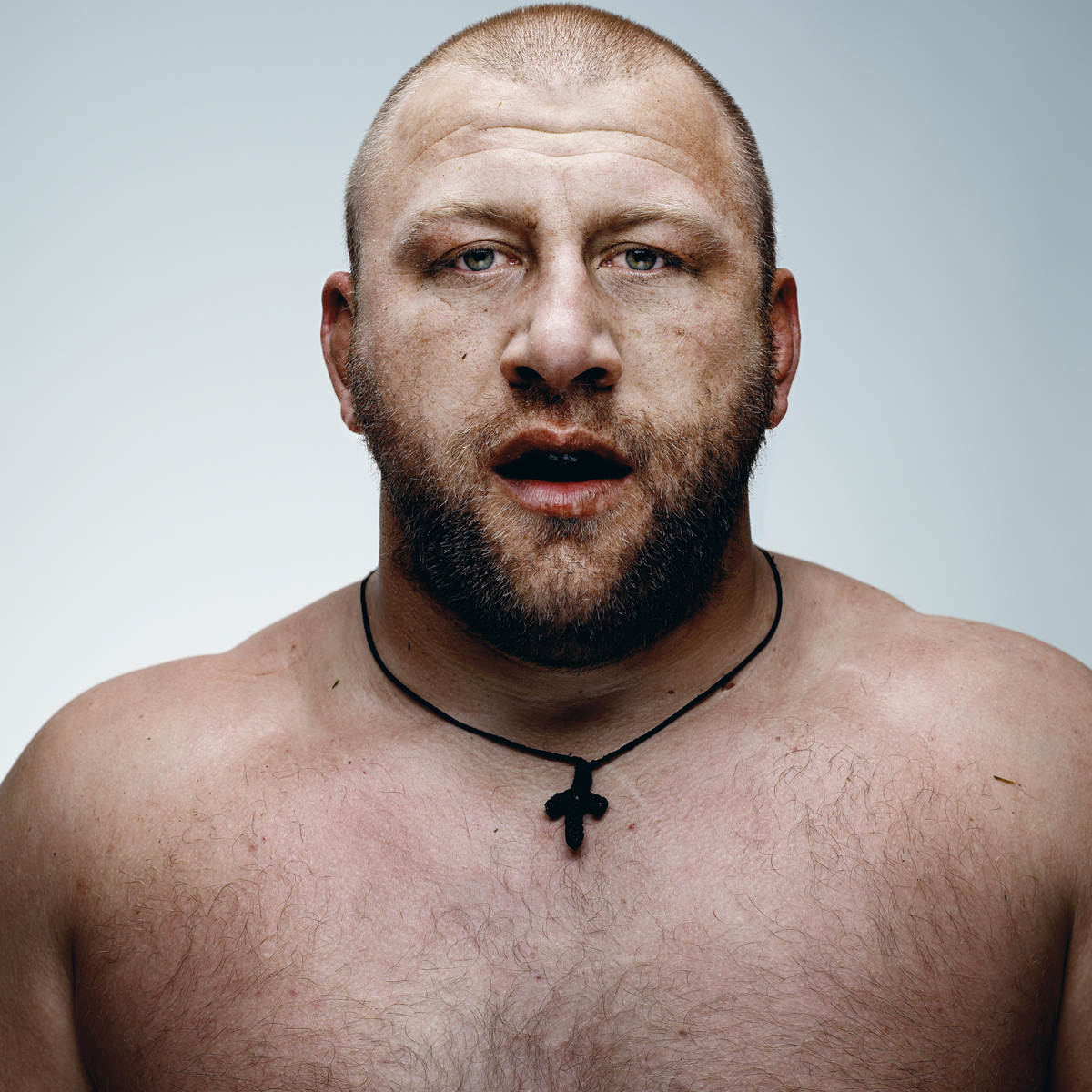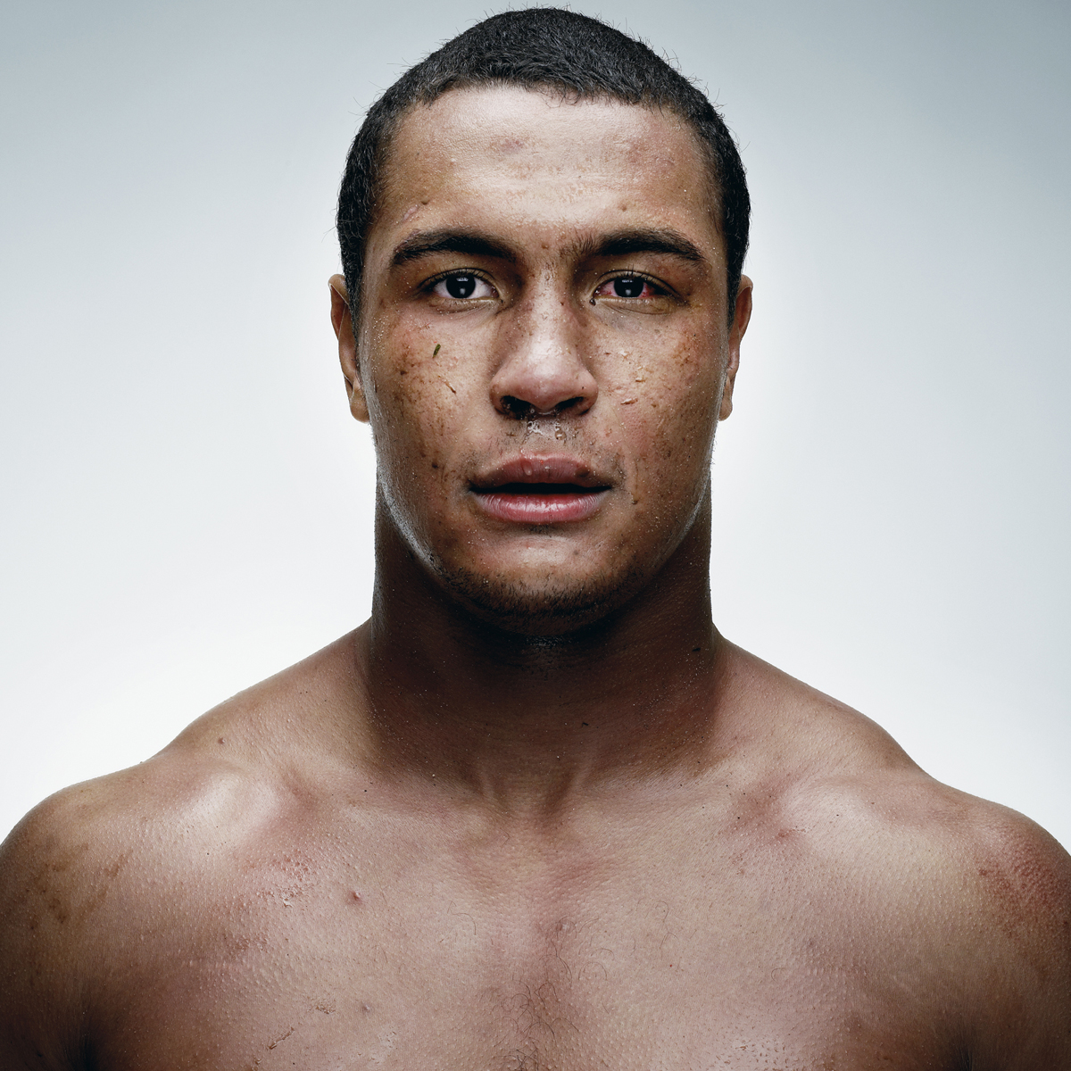 Instinctivement, j’ai toujours aimé le rugby. Sans jamais vraiment m’en approcher. Ni amateur, ni supporter. Au fond de moi pourtant, j’ai toujours été fasciné par la force brute que dégagent ces hommes. Par leur beauté déconcertante, aux antipodes des canons habituels. De cette attirance est née, en 2004, un premier projet photographique, réalisé pour l’Equipe Magazine, que j’ai appelé « Broken faces ». Une série de portraits très serrés des piliers du XV de France. J’en souhaitais plus. Il me fallait un sésame. J’ai alors montré mes photos à la Ligue Nationale de Rugby. Leur enthousiasme m’a donné des ailes. Leur soutien m’était indispensable. Ils me l’ont offert sans compter. Au printemps 2006, les présidents des quatorze clubs du championnat de France m’ont ouvert les vestiaires de leurs équipes. J’ai attendu, dans les entrailles des stades, la fin des rencontres pour tirer le portrait des joueurs en « sortie de match ». Pendant ces quelques minutes où, hors du terrain, ils sont encore dans l’élan du jeu. Haletants, suants, abîmés, ils portent alors sur leurs visages et leurs corps les traces vives de ces quatre-vingts minutes de lutte acharnée. J’ai voulu voir sur eux les marques de l’affrontement: les coups et les intempéries, la rage et l’épuisement. J’ai cherché à attraper cet instant, avant que ne disparaissent les stigmates de l’oubli absolu d’eux-mêmes. Au moment où ces hommes ne sont plus des bulldozers et pas encore des dieux du stade. Ils reviennent de l’effort surhumain. Ils redescendent sur terre où l’esthétique n’est plus celle du combat.