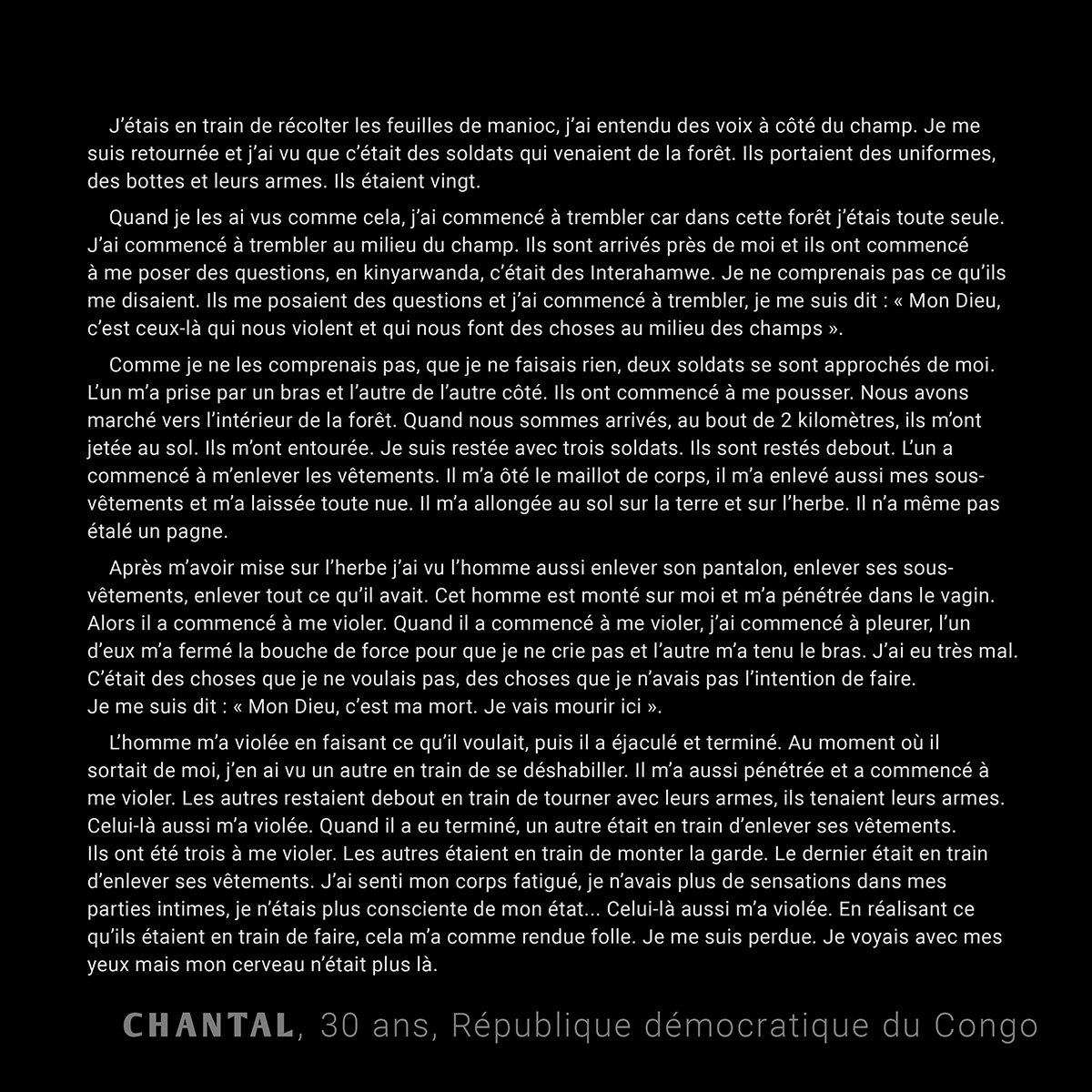 Depuis trente ans, j’ai photographié de nombreuses femmes en représentation. Elles attendaient de moi une image contrôlée, lisse, sans accroc. Ici, avec les unsung heroes que j’ai rencontrées, ce sont les ombres qui entrent dans la lumière. Des bleus et des fêlures à la surface de la peau, dans le creux des yeux. Ce sont les voix, les mots, le timbre authentique de l’expérience intime de la violence qui s’expriment. Pour dire la souffrance particulière vécue par les femmes. Pour dire aussi la force d’être femme. La capacité à se relever et à se battre, encore.